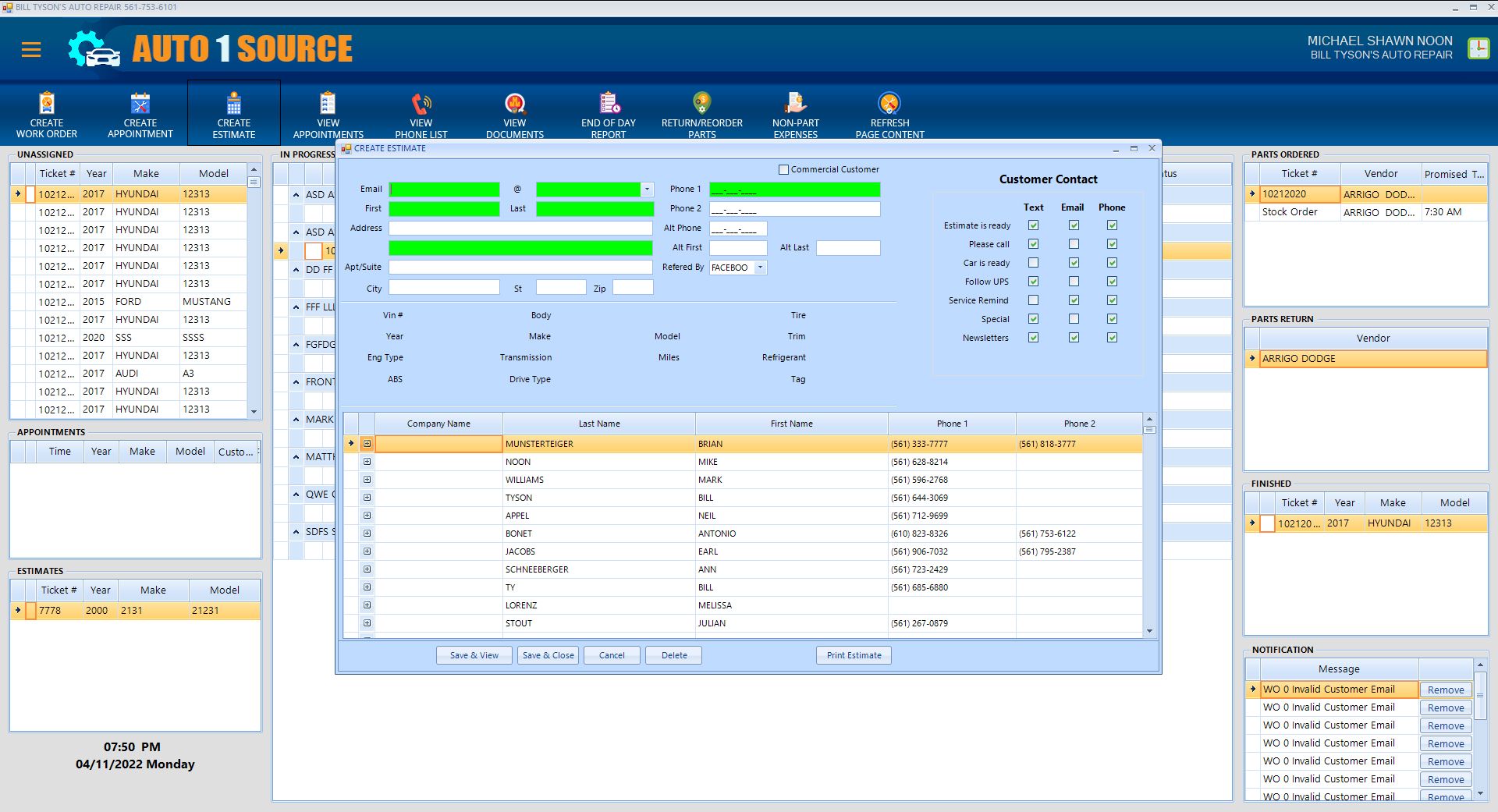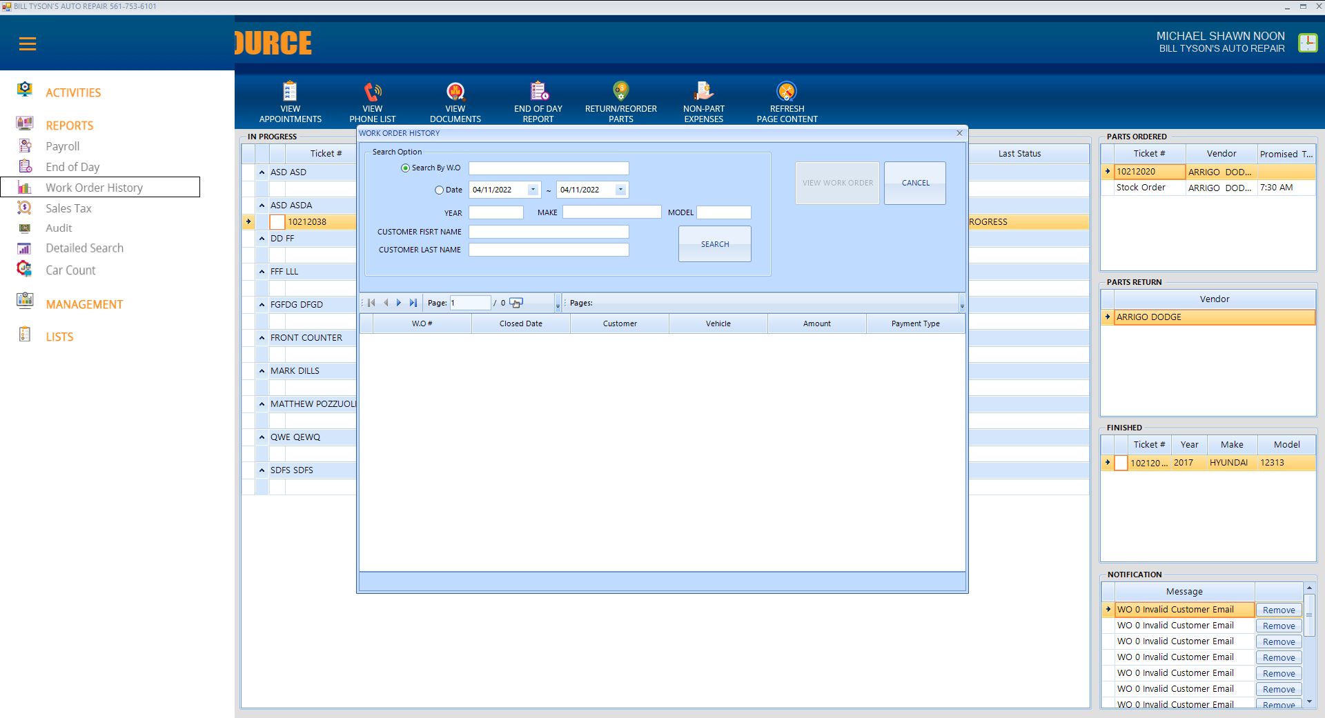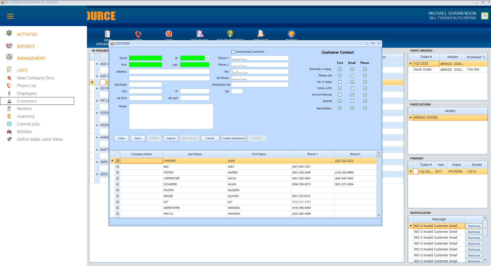 Creating Work Orders is an easy process. Convert an Estimate to a Work Order with a simple click. Start a Work Order Directly with a search for your customer & vehicle via Email, Phone, First Name or Last Name. Add custom or canned jobs, add parts & labor. The parts search and canned jobs are built into the process. Your customer will be notified via phone, email and/or text when their car is ready.