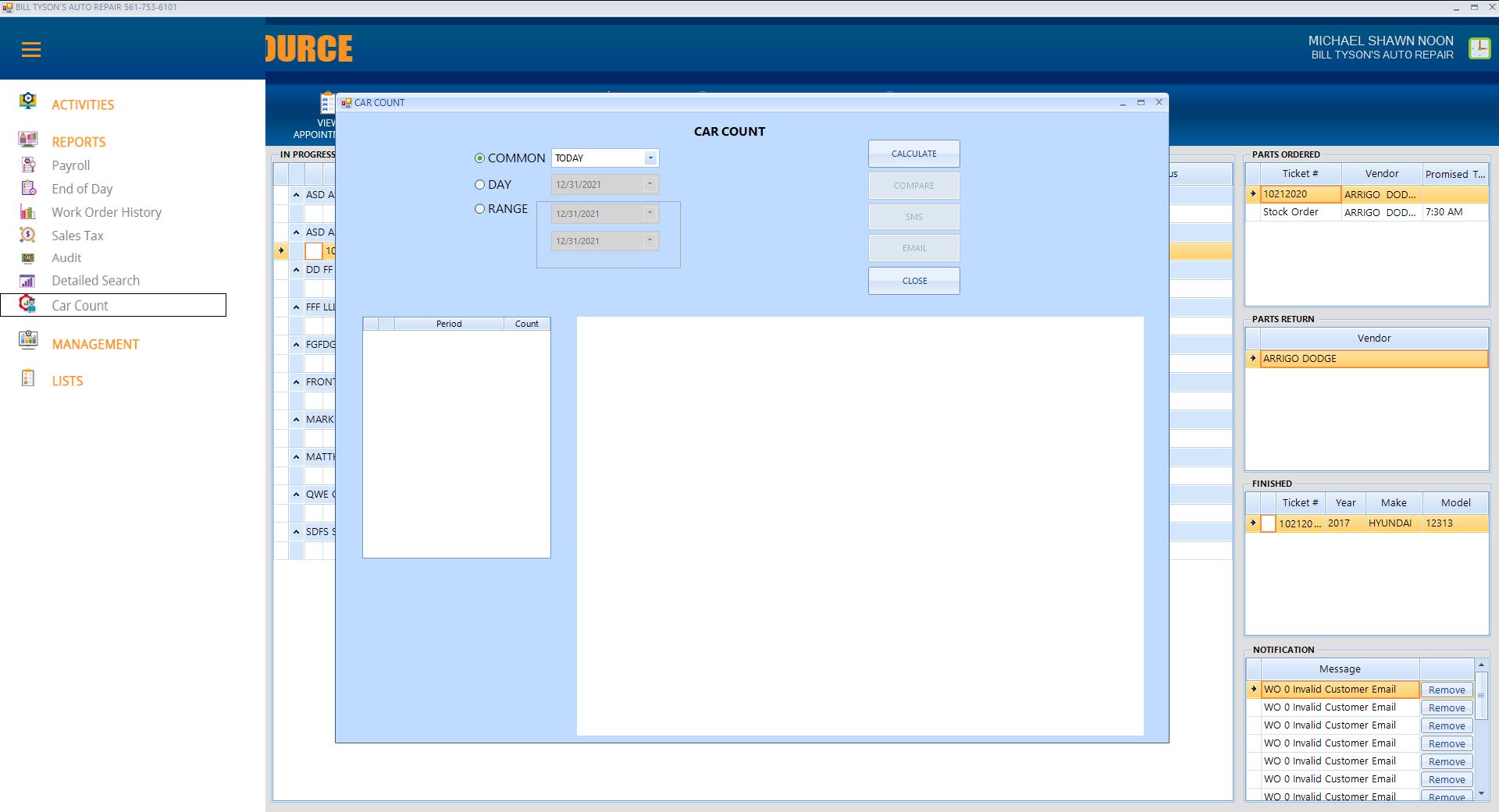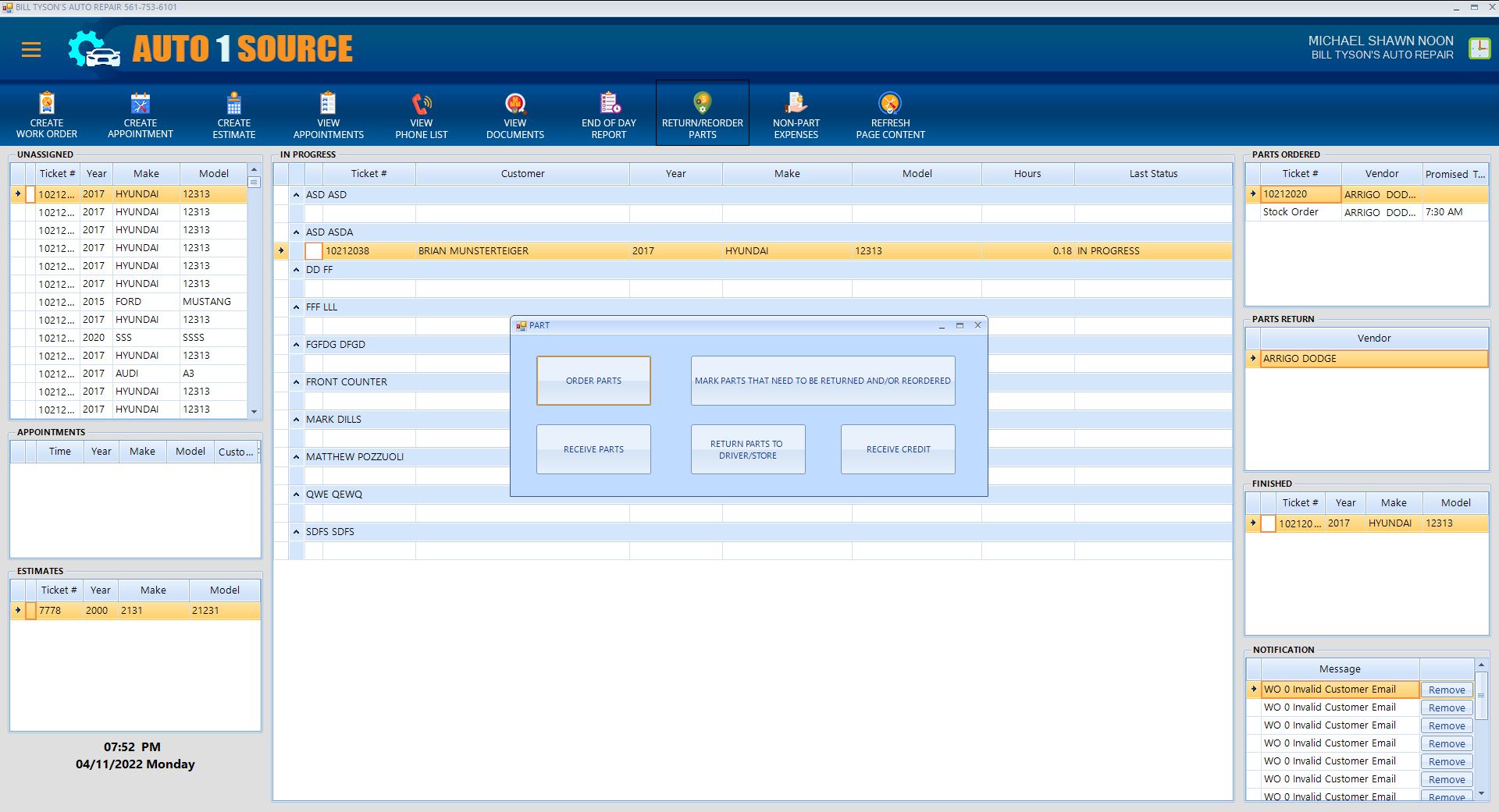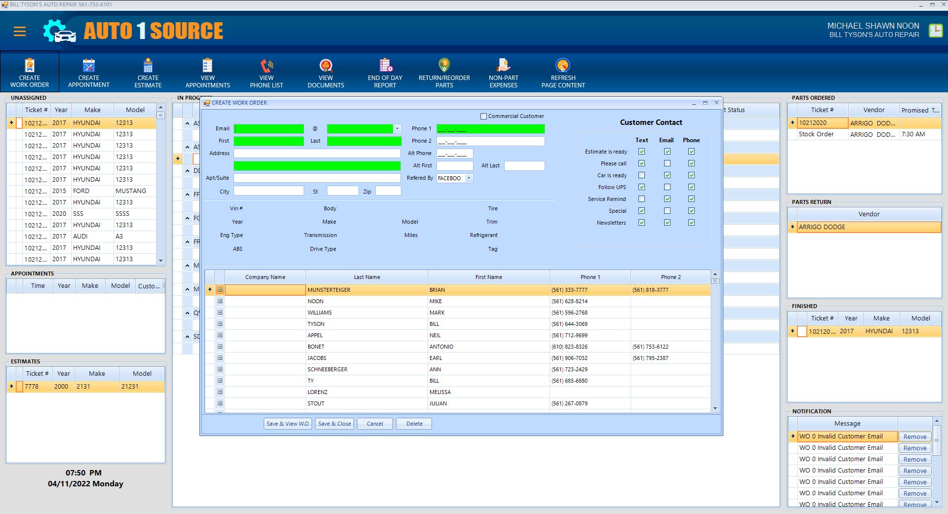 Creating Work Orders is an easy process. Convert an Estimate to a Work Order with a simple click. Start a Work Order Directly with a search for your customer & vehicle via Email, Phone, First Name or Last Name. Add custom or canned jobs, add parts & labor. The parts search and canned jobs are built into the process. Your customer will be notified via phone, email and/or text when their car is ready.